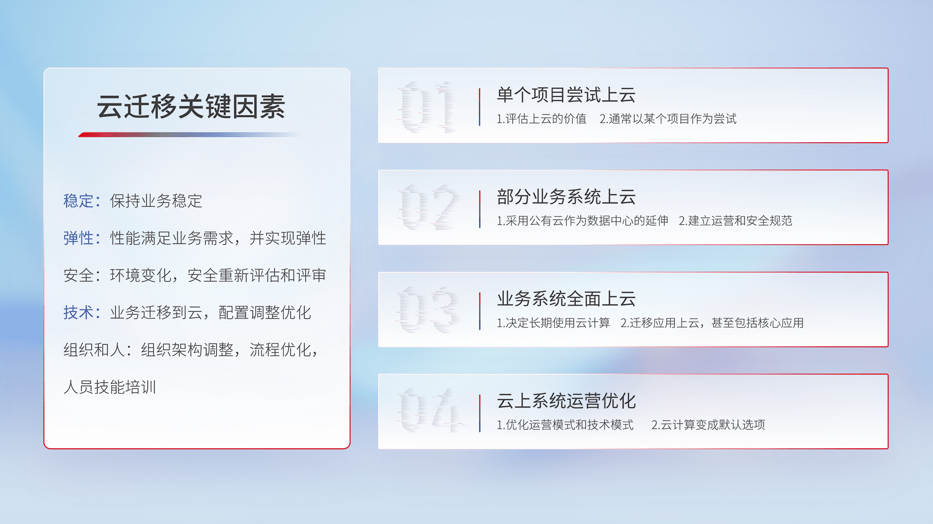 结合实际业务,,,从规划设计、、云平台选型、、云原生改造、、数据迁移、、、、集成交付,,迁移全过程为客户识别最佳上云路径,,,做好风险识别管理,,,设计网络架构、、、、身份权限、、安全审计合规、、操作审计、、日志审计、、、、监控告警策略、、多站点容灾设计等,,对云上基础设施进行整体规划,,提升IT治理水平,,,,以满足弹性、、、高可用、、高性能的需求。。。